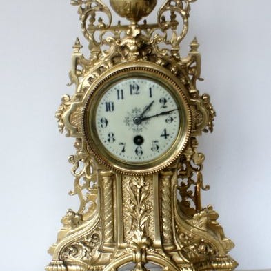 Uret er håndoptrukket, det ringer højlydt, og af og til fungerer det. Jeg ved ikke hvilket materiale det er. Jeg købte det i Frankrig. Det stammer fra Paris. Årene 1850-1860. Signeret. Jeg kender heller ikke vægten. Jeg har ikke vejet det, men det er tungt.