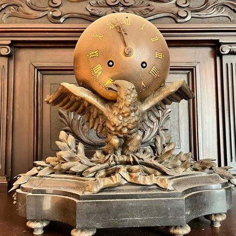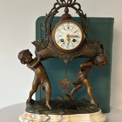 En marmorfigurur ur fra Vincenti & cie i Art Nouveau-stil med mekanisk 8-dages urværk og halvtime-slå på klokke, fransk oprindelse, 40×25×12 cm, vægt ca. 6 kg, opkrøsningsnøgle inkluderet, i god brugt stand og i gang. Klik på den blå "gå til varen" knap, for at købe eller byde på denne vare. Den samlede pris vil blive vist inden du afgiver dit bud.