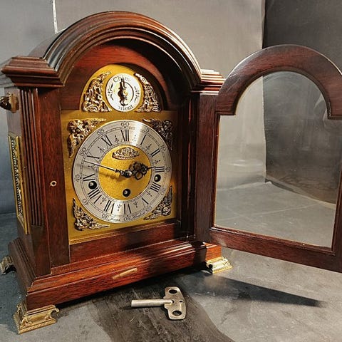 Orfac bordsklok fra mellemkrigstiden (1969) med mekanisk otte-dages urværk i en messingleverand og teak bagvæg, stående på en dekorativ metalskæder base med messingskloge fødder og en messingtoppet krone, i Art Deco stil, uden slag, i god brugt stand og i funktion med nøgle inkluderet. Klik på den blå "gå til varen" knap, for at købe eller byde på denne vare. Den samlede pris vil blive vist inden du afgiver dit bud.