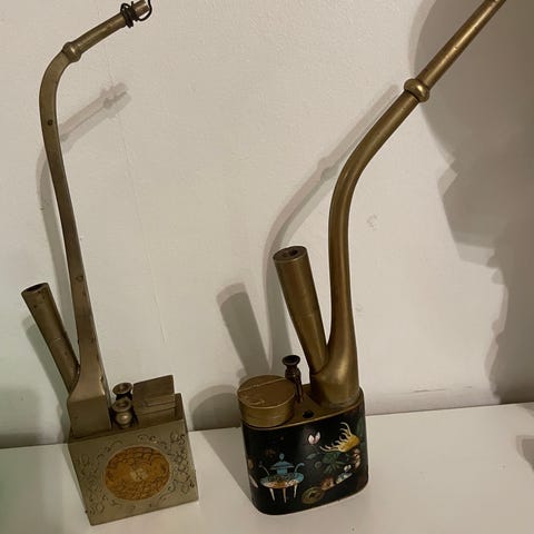 komfur lavet af messing og en sølvplade på toppen -