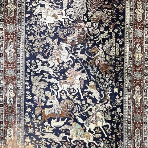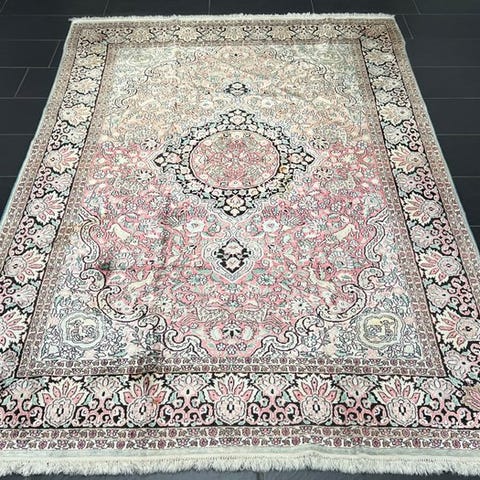 Fremstillet af 100% håndknuddet silke med traditionelle motiver.