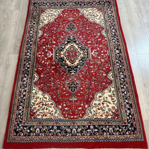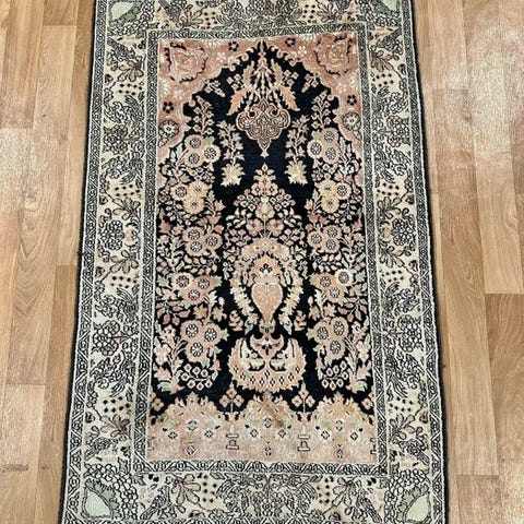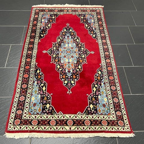 Håndvævet orientalsk tæppe fra Indien (provinsen Ghoum), mål 200 × 130 cm, uld på bomuld, i god stand. Klik på den blå "gå til varen" knap, for at købe eller byde på denne vare. Den samlede pris vil blive vist inden du afgiver dit bud.