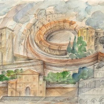 UMBERTO BONETTI, "Catanzaro aeroveduta", slutningen af 1930'erne, 18x26 cm, med ramme 48x63,5x2, 3 kg, blandet teknik på karton, værk med ægthedscertifikat. På fronten: underskrift nederst til højre. Værket med ramme som gave.