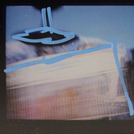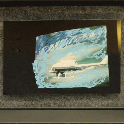 DMS17 - MARIO SCHIFANO, Uden titel, 1990-1997, håndmalet fotografi, mål: 10x15 cm. På bagsiden: en beskrivelsesfane og kunstnerens underskrift. Værket arkiveret ved Det Generelle Arkiv for Mario Schifano-arbejde nr F90-97/6576 registreret den 24/09/2007 i Rom. Værket offentliggjort i kataloget Fondazione M.S Multistudio på side 290 i bind V og i kataloget Fotografie Ritoccate på side 50 i bind I. Værket med ramme