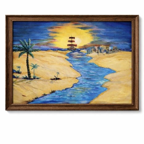 Dette surrealistiske værk viser to barnlige figurer i kapper, der ser ud til at være i gang med en samtale.