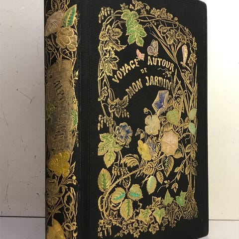 Originaludgaven og første oplag af dette meget smukke værk om Jardin des Plantes i Paris, bevaret i en flot romantisk bindning i halvskind, gyldne filetkanter omkring forsiderne, ryggen prydet af forgyldte jernbeslag med personlige motiver (påfugle, aber, ørne m. fl.) toppet af titlen og rinceaux i forgyldte beslag.