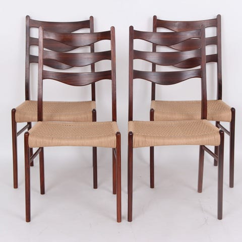 Sjældent sæt vintage spisestuestole designet af Arne Vodder i palisander produceret Sibast Møbler. En smuk unik stol med god sidde komfort og god rygstøtte. Mål: bredde 49 cm, dybde 54 cm, højde 76,5 cm, sædehøjde 45 cm.