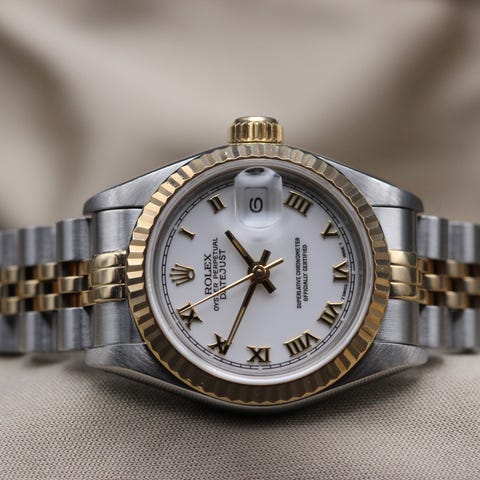 Denne elegante Rolex har et Jubilée-rem, en matchende kasse i rustfrit stål og en guldfarvet rillet bezel.