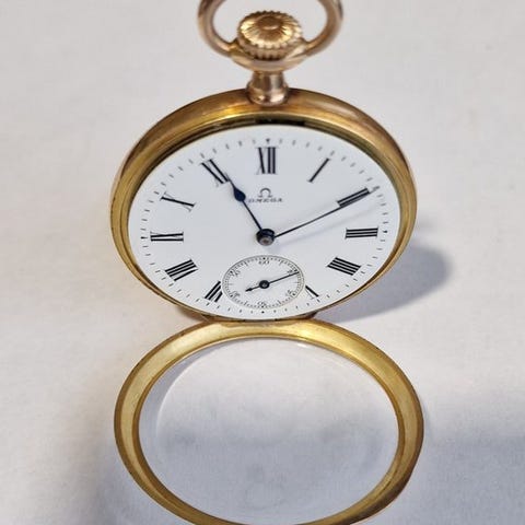 Et velbevaret eksempel på et klassisk schweizer guld lommeur, egnet til samlere og entusiaster af vintage Omega-ure.