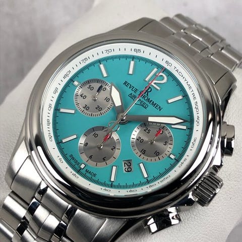 Urskive: Blå. 3 under-urskiver i sølv. Kalender kl. 3. Day-Date. Luminiscerende indeks. Luminiscerende visere. Central sekundviser.