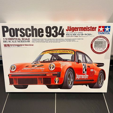 Dette er en enestående mulighed for at erhverve et meget eftertragtet, usamlet Tamiya 1/12 Big Scale Series modelbyggesæt: den ikoniske Porsche 934 RSR Turbo i den uforglemmelige Jägermeister-look.