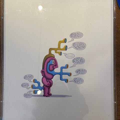 Daniel (DADARA) Rozenberg (1969) lavede 'Rainfactory 2' i 1998, et originalt akrylmaleri i surrealismen, håndsigneret og solgt med plexiglasramme, målene er 50 × 44 cm og vægten 3 kg. Klik på den blå "gå til varen" knap, for at købe eller byde på denne vare. Den samlede pris vil blive vist inden du afgiver dit bud.