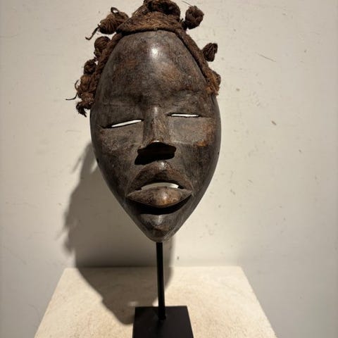 Fangmaske fra Río Muni, Ækvatoriale Guinea, udhugget i træ og skind, dateret omkring 1900–1910, provenance fra gammel spansk samling, Argiles Collection, Barcelona. Klik på den blå "gå til varen" knap, for at købe eller byde på denne vare. Den samlede pris vil blive vist inden du afgiver dit bud.