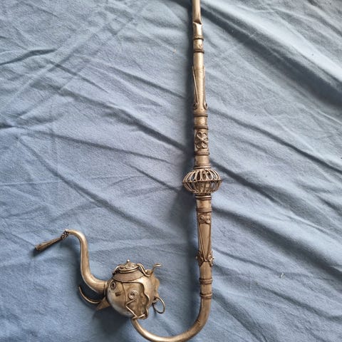Smuk i størrelse, kvalitet og antikvitet er denne Bamileke-pibe med terracotta-koger. Pipen er heldigvis nået ned til os, og er ledsaget af sin gennemhullede stok, lavet af en ujævn gren af hårdt træ, med en spiralformet snoet kobberstift i spidsen for at symbolisere ejerens økonomiske velstand.