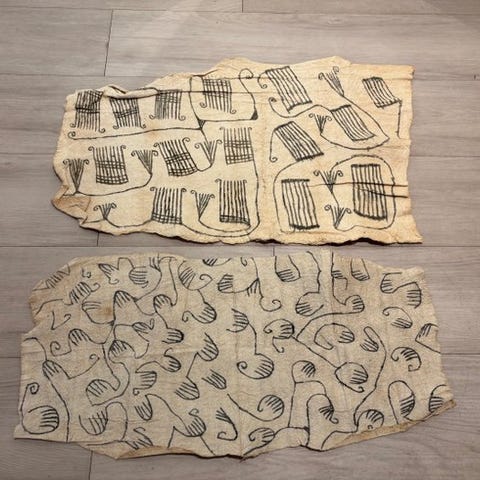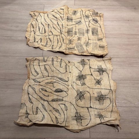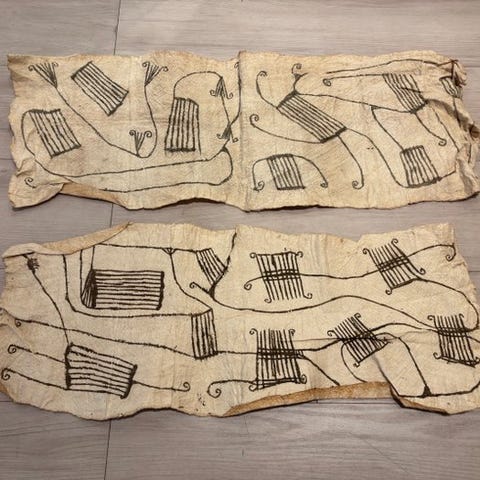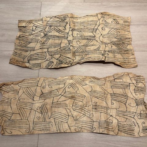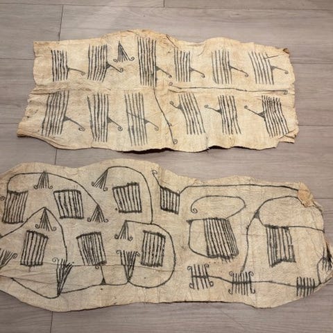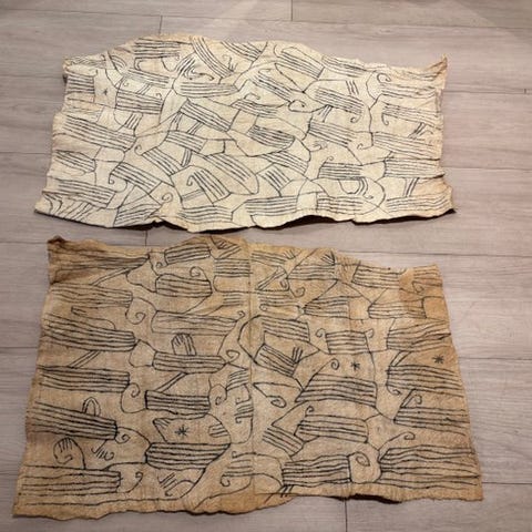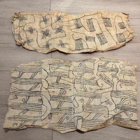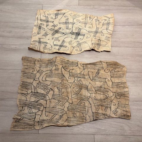 Fire Tapas‑stykker af Mbuti fra Congo, dateret ca. 1940–1960, hver 80 cm × 40 cm, fra en belgisk privat samling og solgt med ægthedscertifikat; ikke inkluderet stand, i god stand med aldersrelaterede slidmærker. Klik på den blå "gå til varen" knap, for at købe eller byde på denne vare. Den samlede pris vil blive vist inden du afgiver dit bud.