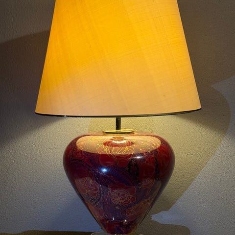 Design bordlampe fremstillet i Tyskland omkring 2000, porcelæn og messing, mål 45 cm dyb, 45 cm bred, 60 cm høj, i funktion og som ny. Klik på den blå "gå til varen" knap, for at købe eller byde på denne vare. Den samlede pris vil blive vist inden du afgiver dit bud.