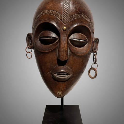 Masque De danse, et Chokwe-dansemaskine fra Den Demokratiske Republikken Congo, fra slutningen af det 20. århundrede, lavet af træ og kobber, 22 cm høj og 15 cm bred, i god stand. Klik på den blå "gå til varen" knap, for at købe eller byde på denne vare. Den samlede pris vil blive vist inden du afgiver dit bud.