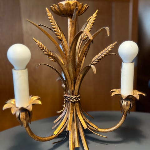 Lampen er udformet som en plastisk blomster- og bladkomposition. Ud fra midten folder adskillige håndformede metalblade og buede elementer sig ud, hvilket minder om en stiliseret blomst eller plante. Overfladen er i en varm guldfarve