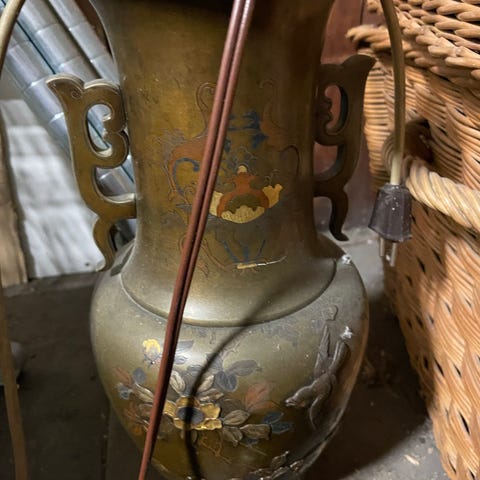 Elegant røgelsesholder af orientalsk produktion, daterbar til 1960’erne, karakteriseret ved en rig og raffineret dekoration, der forener asiatisk tradition, kolonial smag og dekorativ følelse inspireret af japansk stil.