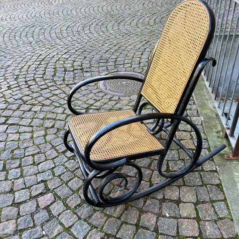 Trægyngestol, fremstillet i Italien, fra 1960'erne, i god brugt stand med mindre tegn på ælde og pletter, dybde 79 cm, højde 92 cm, bredde 59 cm. Klik på den blå "gå til varen" knap, for at købe eller byde på denne vare. Den samlede pris vil blive vist inden du afgiver dit bud.