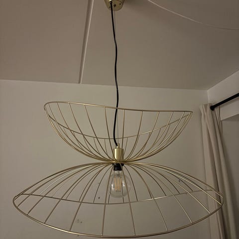 Den øverste kromring har et slidspor. Det har ingen indflydelse på lampens udseende eller funktion. Den metalliske kromkabelbeskyttelse, som er tilsluttet loftet, er i god stand uden