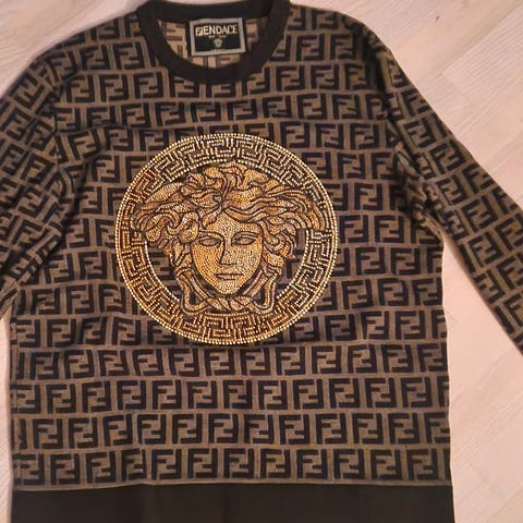Meget pænt sweatshirt, sort, Fendi med skrift i sort og guld foran, lille gylden og sort snor langs siderne.