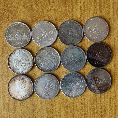 Lot på 5 mønter fra Republikken Italien, 1.000 Lire Concordia 1970, 14,5 gram hver i sølv 835, 12 gram i rent sølv hver.