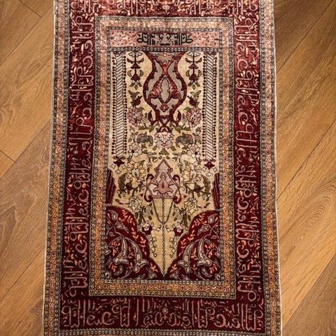 Oprindelsesland Tyrkiet, Hereke-kvalitet miniature silke bønnerug, mål 63 x 46 cm, 100% silke på silke, i fremragende stand. Klik på den blå "gå til varen" knap, for at købe eller byde på denne vare. Den samlede pris vil blive vist inden du afgiver dit bud.