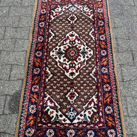 Håndvævet tæppe fra Indien i rødt, 150 x 105 cm, uld på bomuld, vægt 8 kg, fremstillet midten af det 20. århundrede, i generelt god stand med alders- og brugsspor. Klik på den blå "gå til varen" knap, for at købe eller byde på denne vare. Den samlede pris vil blive vist inden du afgiver dit bud.