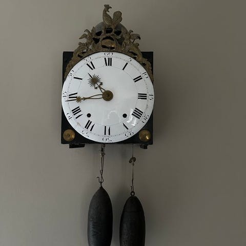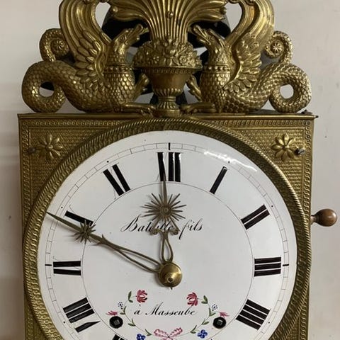 Et gammelt Comtoise‑ur i jern med mekanisk 8‑dagesurværk, dateret til 1700–1750, Louis XV‑stil, højde 31 cm, bredde 14,5 cm, dybde 10,5 cm, vægt 2 kg, half‑time ringning på én klokke, oprindelig fra Haute‑Saône, Frankrig, i god brugt stand og i funktion, kun til salg inden for EU. Klik på den blå "gå til varen" knap, for at købe eller byde på denne vare. Den samlede pris vil blive vist inden du afgiver dit bud.