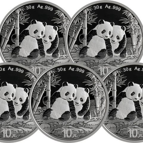 Fem sølvmønter á 1 oz fra China Panda 2026-serien, samlet vægt 5 x 30 g, renhed 999,9/1000, præget af China Gold Coin Incorporation. Klik på den blå "gå til varen" knap, for at købe eller byde på denne vare. Den samlede pris vil blive vist inden du afgiver dit bud.