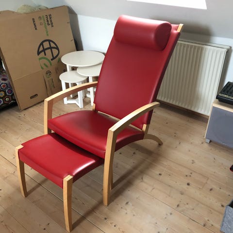 Mål stole: h 100 og 82, b 65, dybde 80 og siddehøjde 45 cm. Mål skammel: 55 x 50 cm, højde 48 cm.