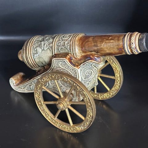 Særdeles flot dekorativ karaffel af keramik, der forestiller en kanon, produceret af Metaxa, det berømte græske brandyhus Metaxa. Denne genstand forener historisk æstetik og anvendelighed: den var designet til at indeholde og servere spiritus, samtidig med at være et dekorativt samleobjekt.