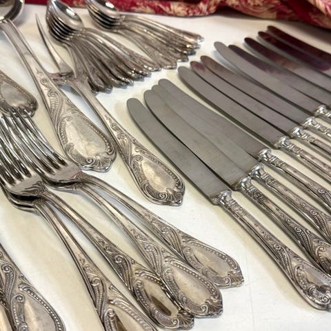 Vigtigt og raffineret fransk bestikservice fremstillet af Orfèvrerie de la Tour, en historisk manufaktur specialiseret i produktion af kvalitetsbestik til både det hjemlige bord og højt profileret restaurationsbrug.