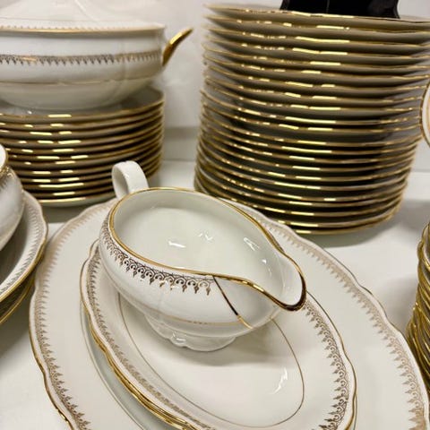 Klassisk design med brede forgyldte kanter og forfinede detaljer — et imponerende sæt, der straks skiller sig ud på bordet og i en samling.