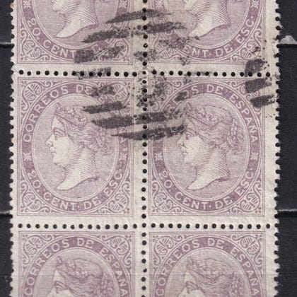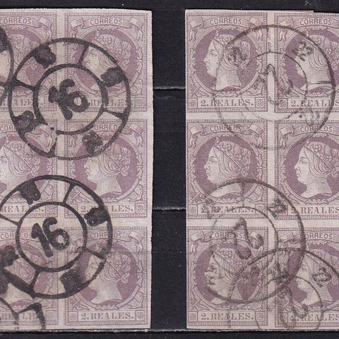 Smukt sort frimærke af 6 cuartos, plade 1, Type 17, med det røde P.P.-aftryk fra Cádiz, brede kanter og friske farver, med certifikat for ægthed og med reference til et lignende auktionstykke, der er indskrevet i Filabo-kataloget.