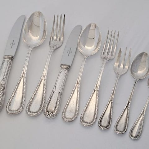 Smukt 12-personers antikt sølvbelagt bestiksæt i en æske, med antioxidantklæder. Produkt fra det belgiske firma CAMA, fremstillet i 1940'erne og 1950'erne. I alt 142 dele. Sættet inkluderer: