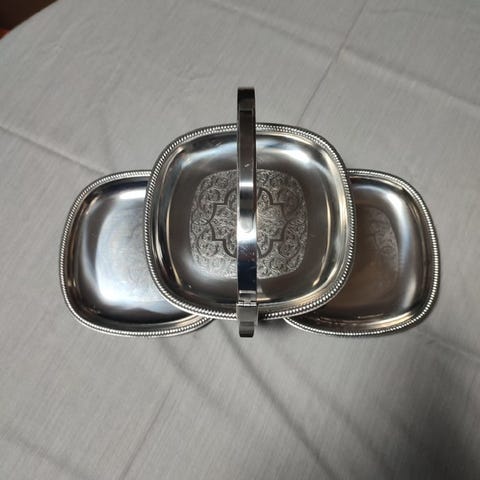 Helt nyt, aldrig brugt, har vidunderlige indgraveringer på håndtaget og på de øverste dele af servicegenstandene foran og bagved!