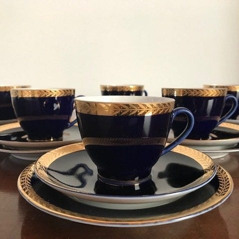Berømt kaffesæt til 5 personer "Golden Daisys" fra Lomonosov Imperial Porcelain Factory i 1970'erne. Formens designer er den berømte sovjetiske kunstner Serafima Yakovleva. Håndmalet, dekoreret med 22 karat guld.