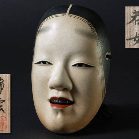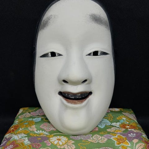 Smuk japansk traditionel udskåret træ-Noh-maske af en kvinde – Fukai深井, fint udskåret med dejlige og søde udtryk, fremstillet af KImai Kōtarō今井幸太郎, og kunstnernavnet var underskrevet på tomobakoen.