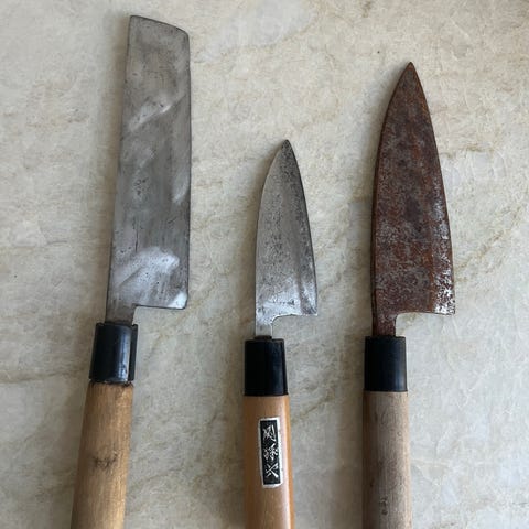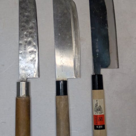Sæt af 3 vintage japanske Deba-knive – håndsmedede, signerede klinger