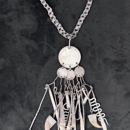 Denne antikke omanske halskæde består af en rund sølv- og gyldne solskive, seksten sølv Maria Theresa-taler-mønter og fireogtredive sølv-dobbeltkugleperler. Det vigtige er, at alle elementerne er slidte og patinerede, hvilket viser deres alder.