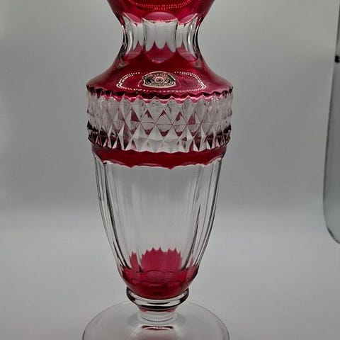 Rød Val Saint Lambert krystalvase fra Belgien, dateret 1950–1970, højde 15,5 cm, halsdiameter 8 cm, base diameter 4,5 cm, i god stand med let slid og to små defekter. Klik på den blå "gå til varen" knap, for at købe eller byde på denne vare. Den samlede pris vil blive vist inden du afgiver dit bud.