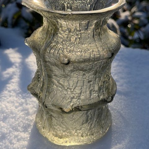 Tilbydes: glas ‘Finlandia’ vase, design af Timo Sarpaneva for Iittala fra 1964. Håndblæst i en forudbrændt træform, hvilket får den særlige tekstur af træets bark til at træde tydeligt frem. Signeret: Timo Sarpaneva og nummereret: 3358. Klar ‘røget gråt/grønt glas’