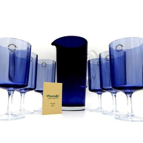 Sæt bestående af syv styk: seks Nason Moretti Model Laila glas/kopper og et centrotavola i gennemsigtigt Murano-glas, Italien, fra 1960–1970, i næsten som ny stand. Klik på den blå "gå til varen" knap, for at købe eller byde på denne vare. Den samlede pris vil blive vist inden du afgiver dit bud.