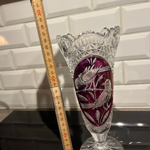 Grøn Bohemisk krystalvase fra Egermann, 35 cm høj, ca. 3,5 kg, massivt grønt med klar bund, håndlavet i Tjekkiet, 1970–1980. Klik på den blå "gå til varen" knap, for at købe eller byde på denne vare. Den samlede pris vil blive vist inden du afgiver dit bud.