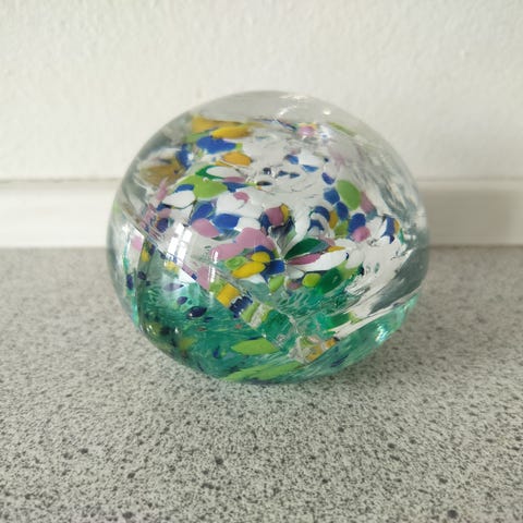 Glas papirvægt med millefiori-dekoration og tekst 'Universiteit Stockholms'. Italien/Sverige, 1950'erne. 5,5 cm i højde, 8,5 cm i diameter.