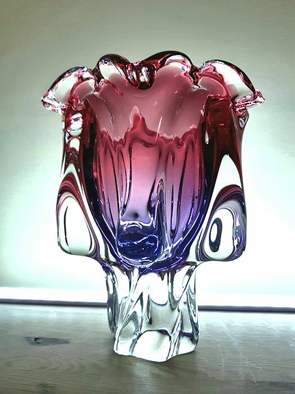En skulpturel vase lavet af koboltblåt glas, skabt i 1980'erne af den danske designer Michael E. Bang for det legendariske Holmegaards Glasværk. Genstandens form følger Bangs karakteristiske stil: en langstrakt silhuet med en udbuet top og et fremhævet relief-'bælte' i den centrale del, hvilket skaber en arkitektonisk rytme og understreger balance i proportionerne.