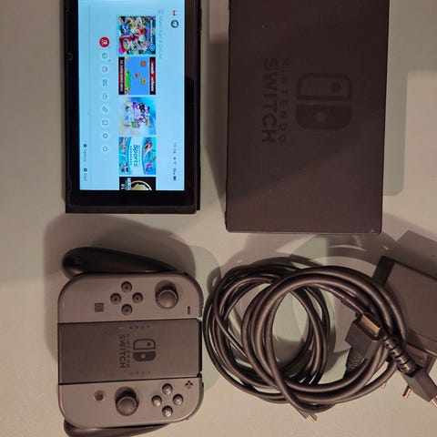 Sprog/region: Standard Switch‑enhed. Strømforsyningen understøtter 100–240 V, så den fungerer fint i Danmark med passende stik eller adapter. Inkluderer oplader og dockingstation.