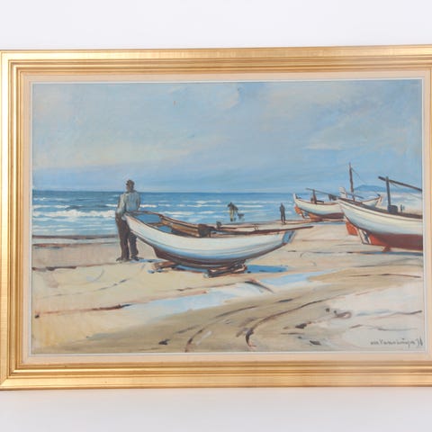 Chr. Valentinussen maleri med motiv af børn ved vand. Maleriet er udført med olie på lærred og i fin gylden ramme. 68x56 cm, ikke ryger.
